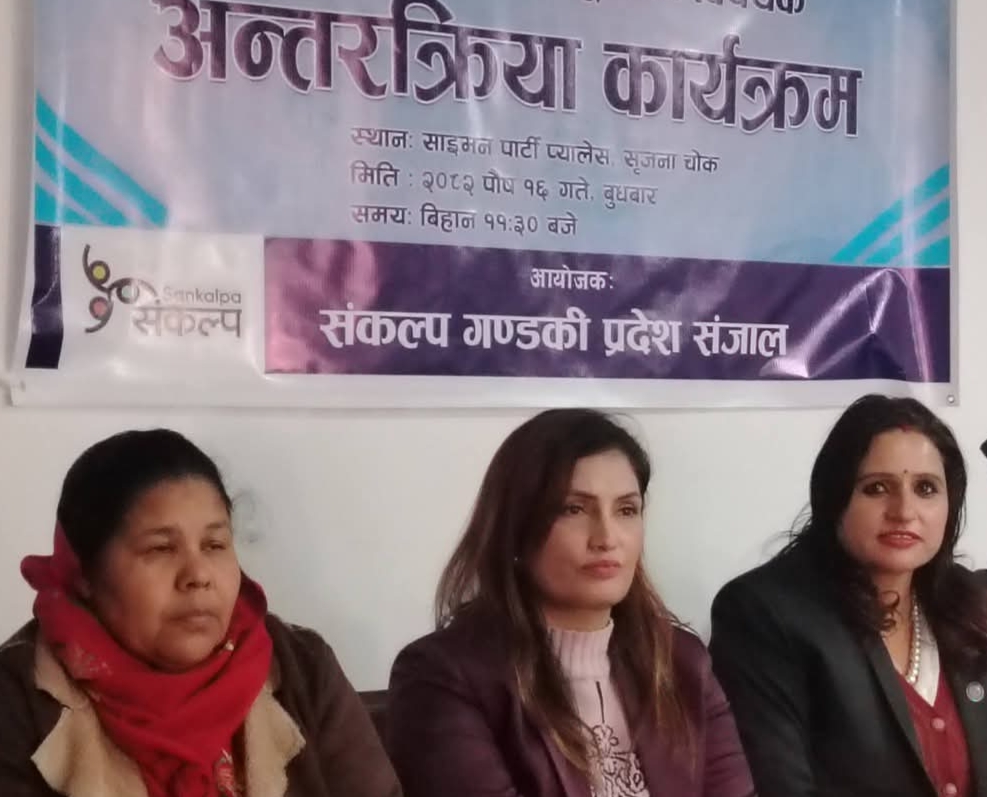 कार्यक्रम शान्ति, न्याय र लोकतन्त्रका लागि समावेशी महिला सञ्जाल (सङ्कल्प) गण्डकीकी अध्यक्ष अधिवक्ता सरिता तिम्सिना पङ्गेनीको अध्यक्षतामा सम्पन्न भएको हो ।